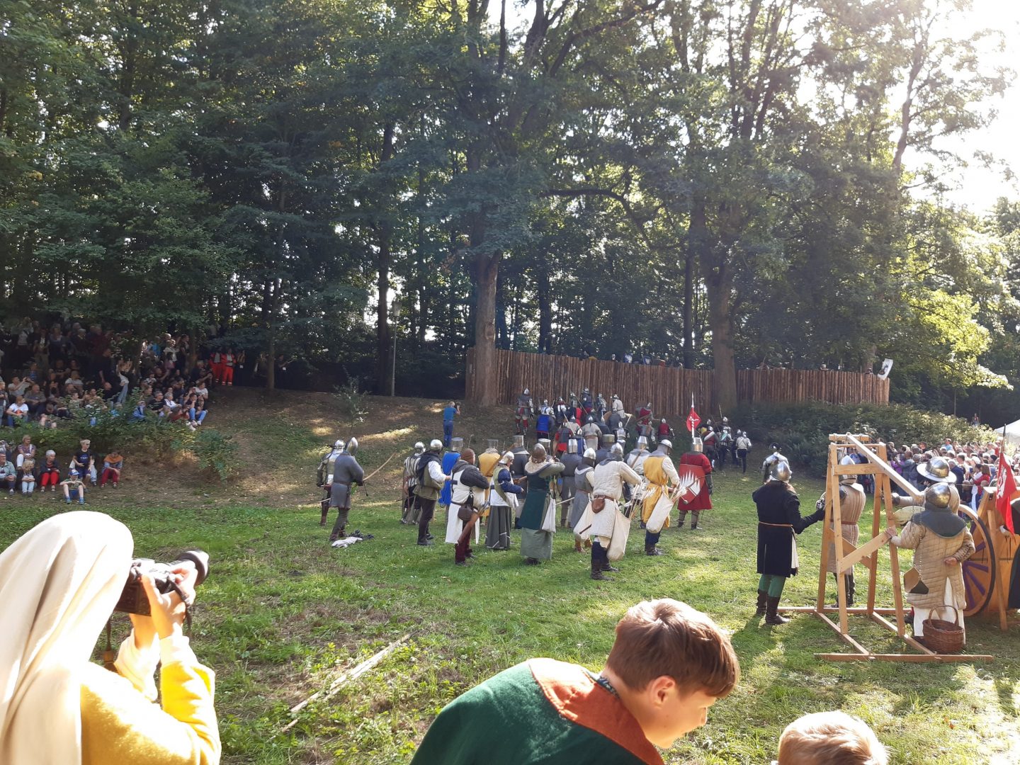 Neben kleineren Trebuchets hatten die Darsteller des 15. Jahrhunderts auch eine Kanone mitgeführt. Die Aufgabe unserer Ritter und Waffenknechte war zunächst der Schutz der Bogenschützen, welche die Verteidiger auf den Palisaden beschäftigen sollten, um den eigenen Truppen ein Vorrücken zu ermöglichen.