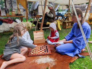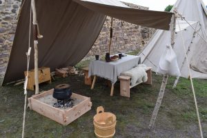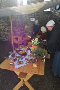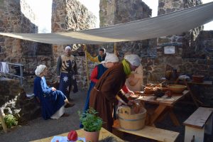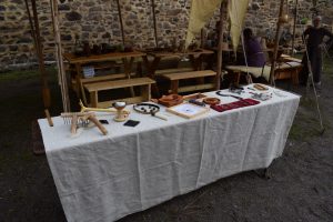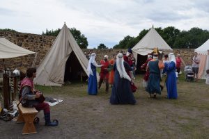 Natürlich war das Museumsfest aber der Grund für unsere Anreise. Wir durften unser Lager wieder im Innenhof am Burgfried aufschlagen. All unsere Zelte standen während der Veranstaltung zum Anschauen offen und auch dabei ergaben sich viele interessante Gespräche. Wie auch im vorigem Jahr, war der Andrang der Zörbiger und Gäste groß. Es waren auffallend viele Kinder mit dabei. Unser Programm bestand aus Tanz, Handwerk, Schwertkampf, Kochen, Zeigen & Erklären und vielen Gesprächen. Unser Schautisch mit Alltagsgegenständen war ein Magnet für die Besucher und einige erkannten sogar Geräte, welche sie heutzutage noch nutzen.