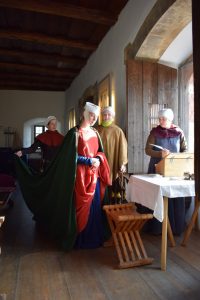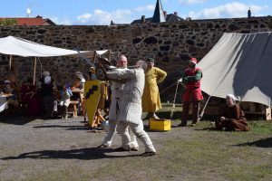 Wir haben uns wieder sehr auf Gnadstein gefreut. Für einige war es auch die einzige Veranstaltung des Jahres. Wir haben den Besuchern wieder ein vielfältiges und für uns durchaus straffes Programm geboten. Aufgrund der pandemiebedingt etwas kleineren Besetzung hatten einige der Herren zwischen Kämpfen, Modenschau, Tanzen und Betreuung des Bogenschießstand zu wechseln. Die Damen zwischen der Betreuung der Besucher im Palas bei Handarbeiten, der Küche und natürlich ebenfalls der Modenschau und dem Tanz. Zum Glück haben einige unserer Knappen und Pagen dewegen ganz selbstverständlich Verantwortung übernommen. Die Größeren haben den Bogenschießstand zeitweise allein betreut. Die Kleineren haben mit Botengängen und kleinen Besorgungen den Zeitplan am Laufen und die Gruppe zusammengehalten. Großes Lob deswegen an unseren „Nachwuchs“.