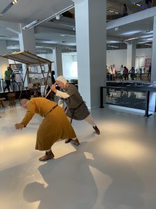 Wir waren mit zwei Stationen im SMAC vertreten. Zum Einen konnten wir Handwerk, Spiele, Tänze und Bekleidung unseres dargestellten 13. Jahrhunderts präsentieren, zum Anderen waren wir gefordert, im Foyer unsere Kampfkünste und Ausrüstung zu demonstrieren. An beiden Stationen hatten wir viel interessiertes Publikum, so dass wir nur wenig Zeit fanden, die vielen anderen Darsteller zu bewundern. Was wir aber wahrnehmen konnten, ist dass auch die anderen Gruppen hochqualifiziert aufgetreten sind. Die Vielfalt, die dabei vom SMAC für diese Veranstaltung organisiert wurde, ließ so einige kommerziellen Märkte schlecht aussehen. Sollten wir in 2022 wieder den Tag mit gestalten, werden wir als Gruppe unsere Kinder mitnehmen. Dass wir sie dann vor Abbau noch einmal sehen ist eher unwahrscheinlich.